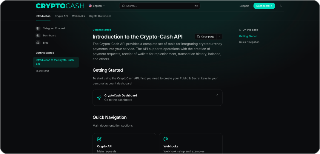 The documentation is already updated, and our support team is always available. If you need a quick walkthrough of webhook setup, key configuration, or signature verification — just message us or open the relevant section in the CryptoCash documentation.